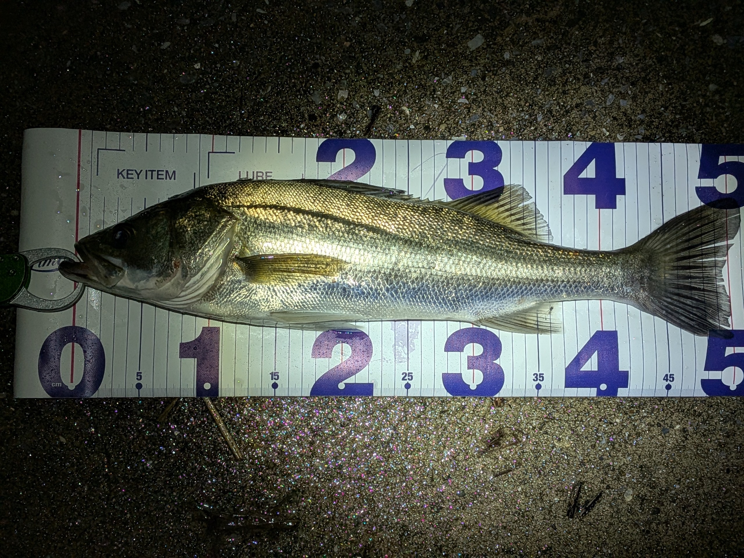 久しぶりのシーバス。サイズは可愛いけど嬉しいね。前日、かなり大きそうなのはバラしました泣